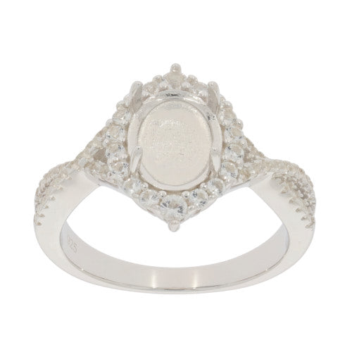 Sterling Silver Semi Mount Ring Setting Oval OV 9X7mm Cabochon Crisscross Shank Halo with White Topaz